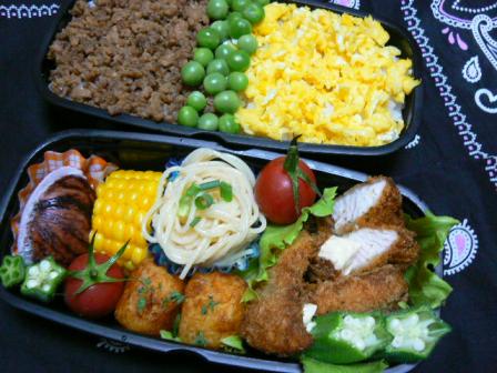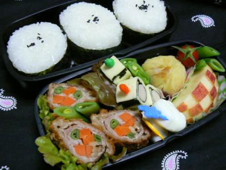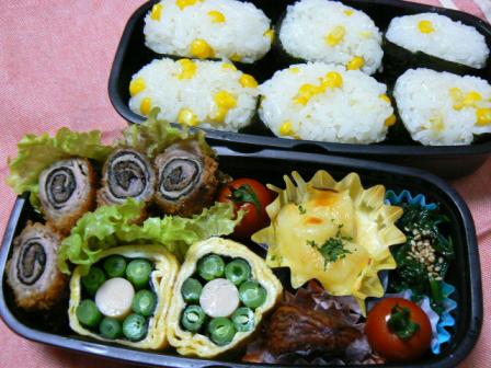 昨日のお弁当コーンごはんおにぎり梅肉と大葉のロールカツ卵巻き(ソーセージ・いんげん)じゃが芋のチーズ焼きほうれん草のナムル栗の渋皮煮 本日のお弁当グリンピースご飯のおにぎり野菜ロールカツ肉巻きじゃが芋 昨夜のおかずのじゃが芋の煮っ転がしを豚肉で包んでフライパンで 焼き、酒・みりん・醤油で味付け煮卵かぼちゃの茶巾たらこスパゲティ