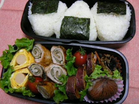 おにぎり(自家製鮭フレーク)青じそ入り豚肉巻き ポン酢風味ソーセージ入り卵焼きひじきの煮物さつま芋のごま焼き栗の渋皮煮ブロッコリーを茹でてあったのに入れるのを忘れてただんだんマンネリ化してきつつあるお弁当今日は食材を調達して自家製冷凍食品作りに励まねば