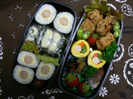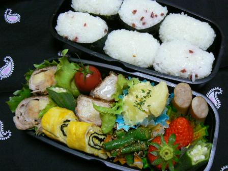 カリカリ梅のおにぎり豚肉巻き2種(りんご・長芋)卵焼き(のり)タラモサラダいんげんの胡麻和えウインナーおくらいちご