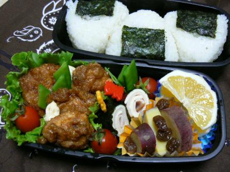 今日のお弁当のメインはチキン南蛮おかかおにぎりチキン南蛮ハム&チーズロールさつま芋のはちみつレモン煮日向夏何か目新しい果物が欲しい