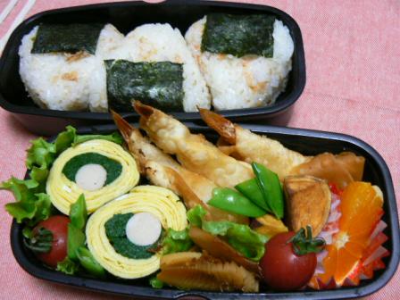 子どもの目覚ましの音で目が覚め・・・20分の寝坊 間に合わないかと焦りましたおにぎりエビフライ卵焼き(ソーセージ・のり)ほうれん草の稲荷揚げ巻き粉ふき芋スパサラ晩柑