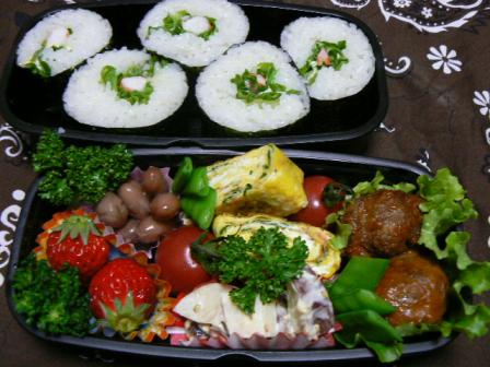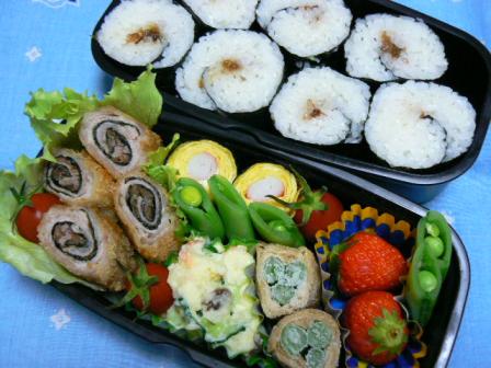 のり巻き(練り梅・鰹味噌)梅肉と大葉のロールカツかにかまの卵巻きポテトサラダいんげんの稲荷揚げ巻きスナップえんどう・フルーツトマトいちご