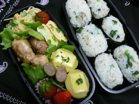 友達から、鶏肉を味噌マヨネーズで焼くと美味しいよ~と聞いたのでおにぎり(青菜・ちりめん)鶏肉の味噌マヨ焼き 鶏肉をフライパンで焼き、味噌・マヨネーズ・みりんで味付けスパサラ卵焼きじゃが芋のチーズのっけウインナーきぬさや、ミニトマトいちご