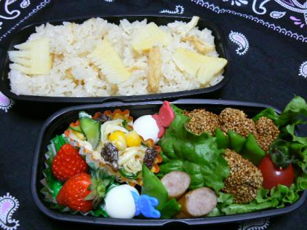 昨日実家から筍が送ってきたので、早速ゆでて筍ご飯にしてお弁当に入れました筍ご飯豚肉のごまだんご【送料無料】好評の「忙しい人のための作り置き」レシピを集めました。よりウィンナーうずらの卵スパサラフルーツトマト、きぬさやいちご今日さらに6本の筍を頂き茹でて、干して保存しようと思ってます