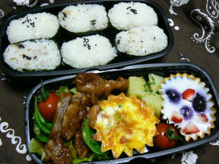 いよいよデザートのフルーツに困ってしまいました おにぎり(ゆかり・豚味噌)豚の生姜焼きほうれん草とトマトのキッシュ 茹でたほうれん草・ミニトマト・冷凍コーンに卵・牛乳・チーズ・塩コショウを混ぜた ものをかけ、オーブントースターで焼く粉ふきいもレタス・きぬさや・ミニトマト牛乳かん(いちご・ブルーベリー)