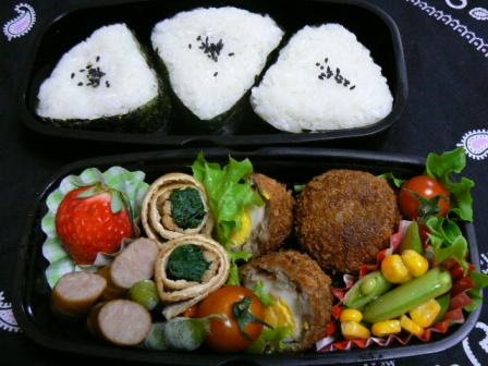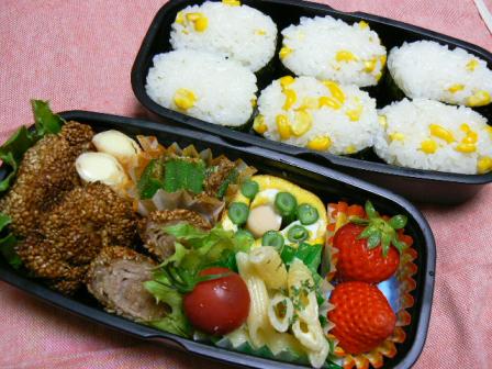 4月15日のお弁当やっと1週間が終了来週からは朝の課外も始まるので、さらに早起きしなければおにぎり(かつおぶしの佃煮)スコッチエッグほうれん草巻き【送料無料】お弁当おかずアイデア帖よりスナップえんどうとコーンのソテーウィンナーレタス、ミニトマト、枝豆いちご