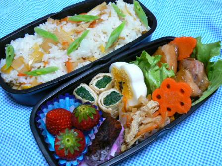筍ご飯鶏肉のはちみつ醤油焼きゆで卵ほうれん草のいなりあげ巻き切り干し大根の煮物栗の渋皮煮いちご