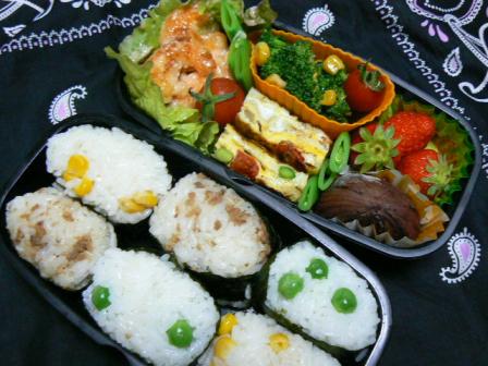 三色丼よりもたべやすいかな~と思い、おにぎりにしてみました三色おにぎり(そぼろ・グリンピース・コーン)えびマヨオープンオムレツ(クリンピース・ミニトマト・玉ねぎ・チーズ)ブロッコリーとコーンのオニオンソテー栗の渋皮煮レタス・フルーツトマト・スナップえんどういちご