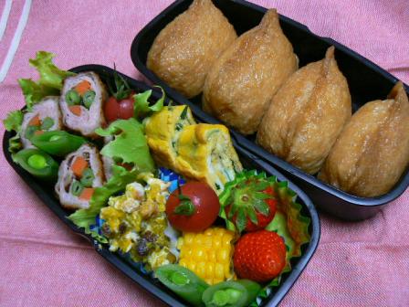 いなり寿司野菜ロールカツ卵焼き(にら)パンブキンサラダ(レーズン・クルミ)茹でコーンスナップえんどう・フルーツトマトいちご