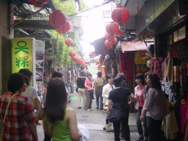 台北から約40キロ。海を望む山の急斜面に広がり、独特な雰囲気を醸し出すレトロな街。 風水学上最高の地形だそうだ。細長い坂の石畳の両側に商店が建ち並び、この素朴な街並みはCMの撮影によく使われ、注目されているそうな・・・ 九分(にんべんに分)PCの不具合により字がでません