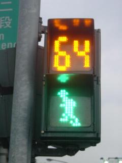 これは台湾の歩行者用の信号機です。上の数字が残り時間。下がアニメーションになっているの。時間がまだあるときは下の緑の人がゆっくり歩いている。残り時間が少なくなってくると、早歩きになってくるんです。結構可愛くて笑えます。日本は黄色、点滅は止まれなのに、台湾は急げ!なんですね。