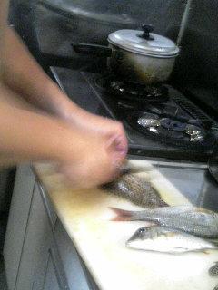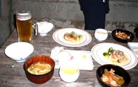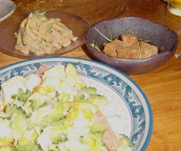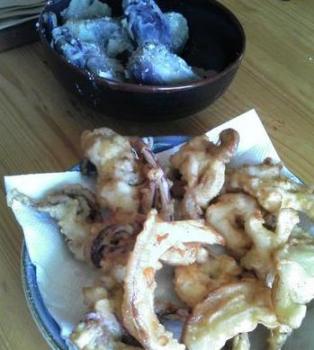 はい、ようやく夕食です。かあさんが持参のご飯を炊いて、おかずの準備。まずは魚を下ごしらえ。ちゃっちゃとね。みんなで手分けして調理に取り掛かる。ゴーヤ、紅芋をてんぷらにして~はーいかあさんはさすが母さんやで。娘「え?これはどないするん?」おーい、それじゃあまだまだ嫁にいけへんなあ・・・なんて言ってたかな?はーい!出来上がりました~左手前が冬瓜とアーサの旨煮に魚のてんぷらを入れました。上がゴーヤのてんぷら、隣が紅芋のてんぷら。白いのがこれアオリイカの刺身です。これに最高級のご飯。まいう~たまりません。自炊ってのもいいもんでしょ?そうそう、ここのお水、すごくおいしいの。食事のあと、マイトーゼから持ってきた泡盛を飲みのみゆんたくです。12時ころ、真っ暗な海にエギをキャストしたら、なんと3回投げて、3杯のアオリイカが釣れました。 爆釣です。船浮最高です。来て本当によかった・・・