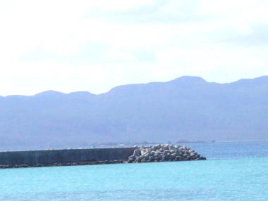 9月26日(火)今日は西表島がハッキリと近くに見える。ピナイサーラの滝が見えるというが、どこなんだろう…朝食に行く途中、港近くでマイトーゼのおじさんと会ったので聞いてみた。「あそこの岩肌が見える?あそこだよ。」ほー。かすかに見える。朝食を食べていると、日がだんだん高くなり、もっとよく見えて来た。感動。マイトーゼの食堂から西表を見た写真。どれがピナイサーラの滝かわかるかな?手前の堤防とテトラポットの切れ目の上です。拡大してみると・・・なんとなく見えましたか?肉眼の方が見えやすいんだけどね。午前の船で鳩間を発つので荷物をまとめ、宿泊代、バラスツアー代を精算にいくと、オリオンビールをごちそうになり、しばらくゆんたく。いいねえ~朝からオリオンだよ。オリオン缶で作った帽子をかぶり記念撮影。「そろそろ時間だね」って売店に西表行きのチケットを買いに行く。私は正確な時間も分からぬまま行動。(完全に娘に任せっきり)娘たちがうさちゃんアイスを購入。かわいらしいアイスだ。味は下のピンクの部分がイチゴ味のカキ氷、ウサギの白い部分がラクトアイスです。もう船の時間。ドラマ「瑠璃の島」のセット【川島美容室】の横をとおり、港へ。鳩間を後にした。さらば、鳩間島!またね~