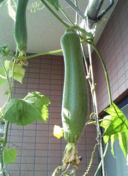 こどもが学校でナーベラー(へちま)を種から発芽させ、苗にして持ち帰ってきた。初夏のことである。バルコニーのプランターに植え、順調に伸びる。伸びて伸びてツルの行き所に困り、同じところを行ったり来たりするよう誘導。やがて、花をつける。が・・・雄花ばかり。結局、実はならないのか・・・とあきらめた矢先、いままでと違う花が。雌花である。でももう10月も半ば・・・これから育つのか?ツルの伸びが止まり、葉の形も違う。雌花も連発。雌花に雄花を受粉させる。すると・・・見る見る大きくなりました。ほら。食べごろかな?こどもに食べられるよと言ったら驚いてた。ナーベラーンブシーにしましょかね~