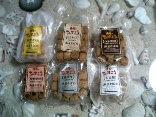 定番の「ちんすこう」北谷の「浜屋」でそばを食べた後、試食で一かけ食べたら、あとを引いてしまったので、全種類買ってきてしまいました。オーソドックスの「プレーン」、コーヒー豆が丸ごとトッピングされた「珍好珈琲」、黒糖の粒が入った「つぶ黒糖」、ココナッツミルク入りの「ココナッツ」、「ごま塩」、「黒ごま」この6種類。程よくしっとりしておいしいんです。浜屋はそばもおいしいし、ちんすこうまで・・・