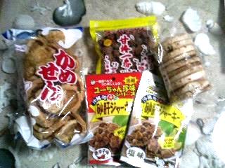 この子たちは、せんべいなどの乾物。一番左から時計回りで紹介します。まずは、亀せん。これは「こわれかめせん」製造段階で割れたり、形が悪かったりのもの。量が多く入っていて、しかも安いので、私はいつもこれ。味はまったく変わらないのでお得です。次が「スッパイマン」私は梅が嫌いなので、普通なら買わないんですが、たのまれものでして・・・次が「塩せんべい」。塩と小麦の素朴な味が好きです。ちなみにこれもB級品です。最後に「砂肝ジャーキー」唐辛子味とこしょう味。こいつも頼まれ物でした。