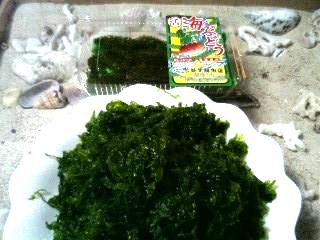 あのプチプチした感触がたまらない「海ぶどう」ほとんどが養殖物ですが、まったく関係なくおいしいです。んで、私の大好物のあーさ。アーサは瀬長島でとってきました。手前がアーサです。丁寧に洗って砂を落とし、干しましょね~これだけあればしばらくもつので、楽しめます。