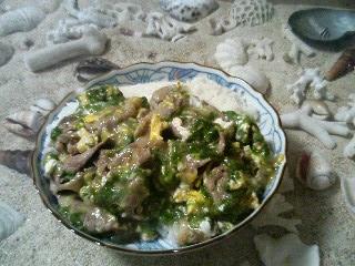 とってきたアーサで早速料理。豚を炒めて、カツオ出汁を入れます。アーサを入れ、塩で味を調えます。溶き玉子を加え、玉子が固まったら、水溶き片栗粉でとろみを付けて出来上がり!