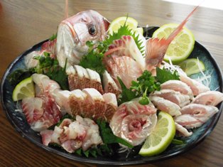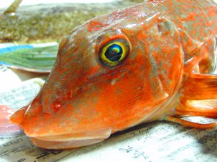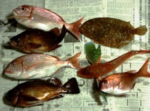 ぼくホウボウです。よろしくさて、つりんちゅは富士夫のお子チャマのお食い初め用の鯛を釣りに行きたい!とずいぶん前から騒いでいたので誘われるまま、外房の大原港「きえい丸」に出撃してきました。ここの釣りはキス用の錘負荷2~10号の竿、PE 0,8号、先糸3号100~200m巻のスピニングリールシャクリ真鯛用のテンヤ、えびえさで釣る。ええ~?こんなんで大丈夫なの?と半信半疑。初挑戦のつり方。富士夫は昨年一人でやってきたので道具も自前。私も一応自前道具を持参したが、レンタル用のを見て納得。俺のじゃダメだ・・・さて、午前船が帰ってきて、午後船の予約メンバー全員そろっているようで、定刻よりずいぶん早く11:45出港。2,30分走り釣り開始。潮の流れが速く、どんどん流される。が、鯛の活性は良いようで、1投目から船中あちこちで500g~1キロクラスの鯛が取り込まれる。私も負けじとがんばるが、勝手がいまいちわからず、あたりはあるが針がかりしない。何度か投入を繰り返すうちになんかかかった。きれいな真鯛でした。難なく坊主を免れた。初しゃくりGET写真撮って右舷で4キロオーバーのBIG真鯛が取り込まれ、船中ヒートアップ!しかし相変わらずあたりはあるが釣れない状況がつづく。もちろん上手な人は次々にヒットさせ、鯛、ほうぼう、ウマヅラなどいろいろな魚がつれている。しかもでかい。富士夫君!ついにヒットー!!写真よろしくえ?ほうぼうだけど・・・撮る?イワシの群れのなかにいる真鯛をえびで釣るようで、その中にでっかいやつを狙うらしい。仲乗りさんが87cmがいるよ~って。すげえ・・・1cm単位で大きさが判るんだ・・・しばくしてポイントを大きく移動し御宿沖へ。真鯛も追加し、ふぐふぐふぐ・・・あたりは頻繁にあるものの、なかなか釣れなかったが久々にガンゾウヒラメ。干物が旨いんだよね~♪さて、夕まづめ。クライマックスは訪れる。富士夫がみごとに坊主を免れ、わらしべ長者のように300gクラスから徐々にサイズを上げながら3連発!そして!4連発め!なんと!!!!!!!!12cmくらいの小さな鯛。よく針かかりしたな~と感心。そして5連発め。なんと真鯛が5連発。竿が根元から曲がり、同時にヒットさせた人やあとからヒットさせた人はもうとっくに取り込んでいるのに、まだやりとりしてる。海面に浮かんだ鯛の腹はでけえ~~~のひとこと。5キロオーバーのでっけえテイ。仲乗りさんが「お食い初めおめでとう!」とがっちり握手。日もすっかり暮れたころ、でっかい黒メバル2連荘で追加し納竿となった。下船後、船頭につり方のレクチャーを受ける。先に教えてもらいたかったけど、経験してからのほうが、言っている意味が判ってよかったのかも知れない。外房のしゃくり真鯛のポテンシャルの高さに感服しました。大原 きえい丸恐るべし。