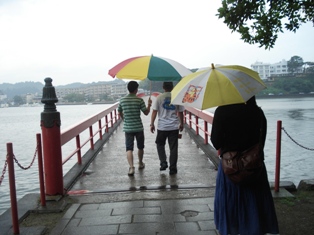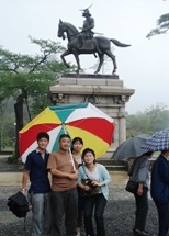 あー松島や、松島や余りにも有名な句ですね。ってか松島を詠んだ句はコレしか知らないんだけどね。雨は降ったり止んだりを繰り返している。昨日に続き、ビーチパラソルを持ち出し散策。なにやら、傘持ちが付いてる中国の御大臣だと思われていたようで・・・(笑)傘持ちT君松島というだけあって、巨大な松がたくさん晴れていたらもっと美しいんだろうね~って言ってたら晴れてきた。うへ~あちい・・・