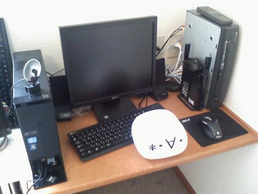 予想以上にでかかったので編集。こんにちは、麦です。改めて今日は実家へ帰宅します。と言うことで携帯からの更新なんですが、どうやらメールによる更新なら写真を上げることが出来るようなので試して見るかなと。埼玉県の自宅の写真です。PC周りの環境を。本体とモニタは買い替えたばかりでまだ新しいです。マウスの中クリックが使いづらいくらい。アヒャ*・∀・のぬいぐるみはシャキーン愛用のふるとり君へのオマージュです。携帯からはやっぱり打ちづらいですね。早くネット環境を、と考える私はネット依存性なんだろうなぁ。今日はここまで。それでは、また。