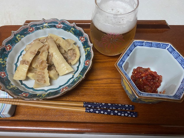 以前NHKBSでも観たことがあるのに、またBS11で「名探偵ポワロ」を見直していますが、何回見てもやっぱり面白いです。ポワロ役のデヴィッド・スーシェ(David Suchet)が好きなのかもしれません。アガサ・クリスティ原作のテレビドラマ「名探偵ポワロ」は1989年に始まり2013年に完結しました。全70話でした。全13シーズンが終わったんですが、BS11 で2024年4月1日から再放送が始まりました。そして全13シーズンの最後にポワロが犯人を殺して心臓の病気で亡くなるところで終わりました。(※殺人犯があまりにも狡猾で善人ぶっているので、ポワロが最終的にその犯人を拳銃自殺に見せかけてベッドに寝かせて、ポワロ自身も心臓が悪いのでベッドに横たわりながら亡くなり終了しました。)そしてまたシーズン1が始まりました。第1話から順番に見ています。昨夜は第6話「砂に書かれた三角形」でした。謎解きといいましょうか、犯人がなかなかわからない所が面白いんです。NHKだとノンストップで見られますが、民放なので途中でコマーシャルがたくさん入ります。私はその間に雑用を済ませます。最初はドラマを見ているのかコマーシャルを見ているのかわからないぐらいで嫌でしたが、もう慣れたのでそんなに気にならなくなりました。昨日は相方が夕方から映画を見に出かけました。午後9時からの最終の映画を見たそうです。2階の若い家族も夕方から出かけました。私は久しぶりに一人ゆっくりビールを飲みながら午後7時からの「名探偵ポワロ」を観たのでした。筍も柔らかくておいしかったけれど、韓国土産の「タコキムチ」がおいしかった。これはビールのおつまみで、後で主食、副食、果物も食べましたよ。相方はシンデレラタイムになる直前に帰ってきました。