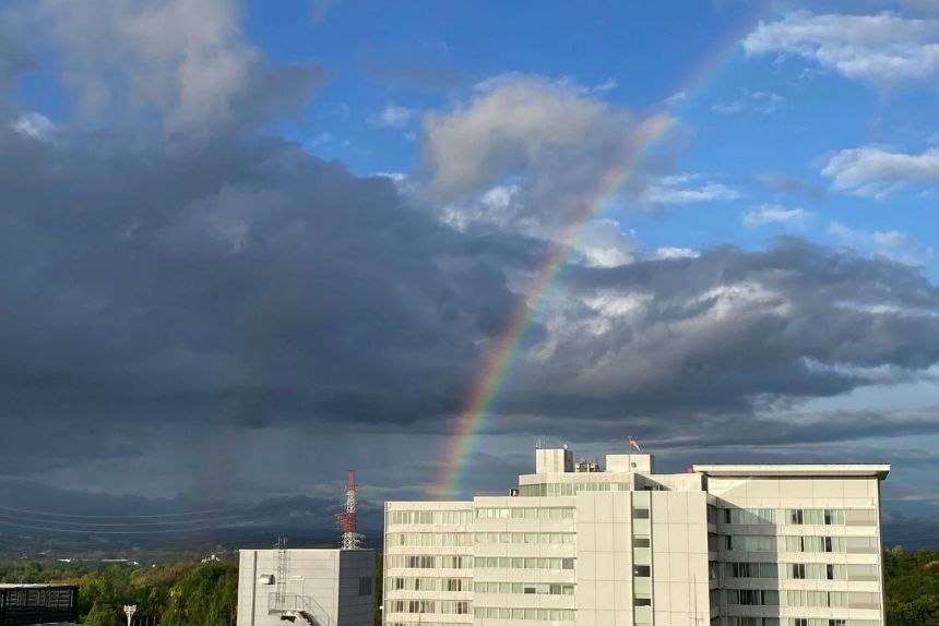 昨日は当市でも未明から雨が降り出しました。1日中雨が降り続きました。そして夕方雨が止むと、空に虹がかかりました。こちらは愛知の娘が仕事場から眺めて撮った虹です。動画もありました。虹が出始めたところから沈んだところまでを追って写していました。動画は載せられないのが残念です。そして当市でも友人が虹を撮っていました。こちらは低いところに虹がかかりました。綺麗な虹ですね。今まで虹の一部を見たことはありますが、こんなにきれいにくっきりと虹の架け橋を眺められたのは初めてです。とても感動しました。今日は憲法記念日ですが、春の収穫祭のステージイベントが開催されます。時間があったらこちらに出かけたいと思っています。仲良しのお友達数人からお誘いが来ました。お友達の知人が出演されるそうです。出かけたことがない場所ですので、ナビに入れて出かけてみようかなと思っています。