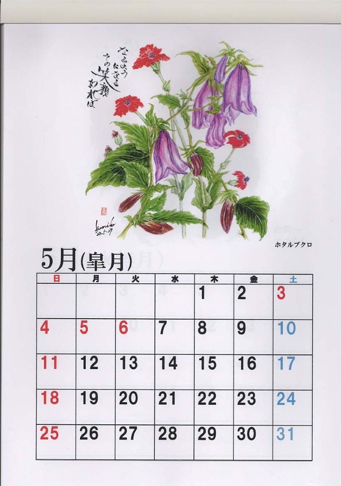 5月になりました。早くも1年の3分の1が過ぎてしまいました。時間が過ぎるのはなぜこうも早いのか?武下さん制作の今月のカレンダーはホタルブクロの絵が描かれています。添えられた言葉は「なるようになる その笑顔あれば」です。端午の節句が近づきました。小さいですが、玄関に飾ってあります。廊下の飾り棚にもポコ君、ノア君、ミラ君の3人の男子が元気に育ってくれることを願っています。今年もGWは旅行はせずにいつも通りの生活をしています。孫たちはそれぞれの学校へ通い、私はダンスレッスンに出かけるだけです。4月半ばに名古屋でミニデモを披露しましたが、その後、残り半分の振り付けを付けてもらい、やっと1曲分完成したのでこれから1か月かけて踊りこむだけです。6月には2回ダンスパーティーで踊る予定ですが、予定はあくまでも未定です。足はまだ完全に治ってはいませんので、体調に気を付けて練習するのみです。ダンスの先生はとにかく坂道を歩いて脚(太もも)の筋肉をつけなさいと言われますが、辛いことはやりたくないというのが本音です。