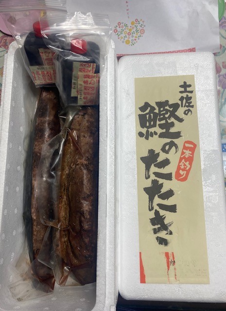 昨日母の日のプレゼントがまた届きました。毎年この時期になると、土佐の一本釣りのカツオのたたきが届きます。ごちそうさまです。そしてありがとう。さて、朝10時半の集合でにじいろ会のメンバーさんたちが喫茶店に集まりました。さえママさんとさえパパさんは遠路はるばる愛知県から来てくださいました。このお店は以前、校区にある近くの小学校へお二人に来ていただき、スライドを見せながら子供たちに交通安全について話をしていただいた帰りに寄ってランチをしたお店です。私が到着すると既に皆さん集まってらっしゃいました。モーニングを食べながら色々と話をしました。皆さん気心が知れたいい方ばかりなので、あっという間に話は解決しました。みんなで記念撮影です。皆さん、私の子供ぐらいの年齢の人ばかりですが、私を親扱い(年寄扱い)せずにとてもフレンドリーなのでとっても楽しいんです。さえママさん、さえパパさんからはお土産を頂きました。今まで愛知の娘家族に会いに行く途中で、いつも立ち寄っていたお店のお菓子でした。別れ際にさえママさんともう一度記念撮影を。まるで母の日のプレゼントをもう一つ頂いた気分になりました。とっても美味しかったです。ありがとうございました。