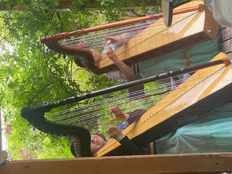 演奏されている小型のハープです。