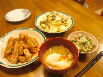 ニートの私は料理作りが1番の楽しみ家はお母さんが料理しないから↓全然知識がないんですけど何とかやってます 今日の夜ご飯 人参の肉巻きキャベツの塩昆布のやつ梅しそご飯味噌汁この前y子オバちゃんに教えてもらったやつさっそく作ったよ教えてもらったレシピで作った肉巻きのたれ最高^^あと味噌汁に卵やってみたよ♪ もっと色々作れるようになりた~い