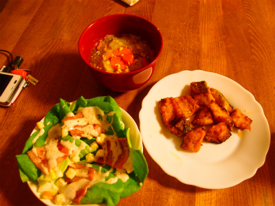 シーザーサラダサバのかば焼き春雨スープダイエット中なのでご飯はなし^^さばのかば焼きめっちゃおいしかった~みんなにも大好評揚げ物って楽しいねただ、もう作りたくない・・・・・・・・ だって手についた生臭いのが全然取れないしまな板、包丁めっちゃくさいしキッチンくさいし(換気扇付け忘れたから)魚のしつこさ異常!このくさいの一発で取れる方法ないのかな・・・・・