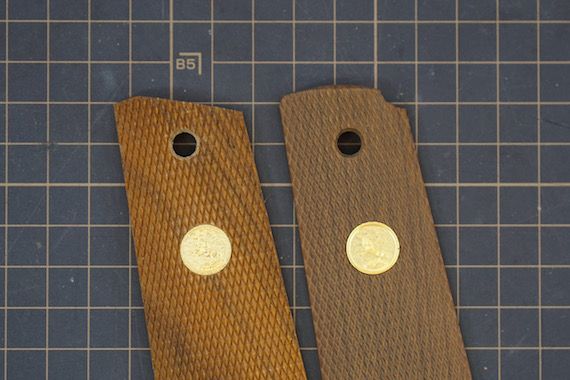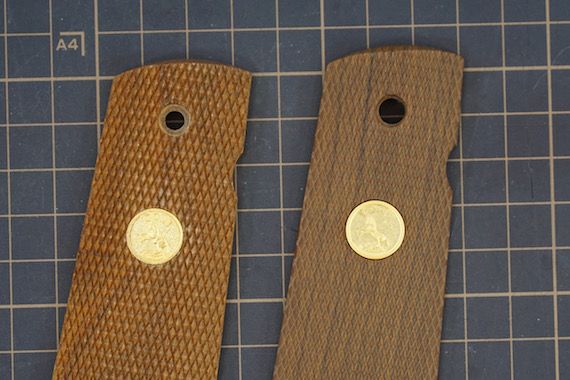シリーズ70は、やっぱりメダリオン付きグリップだと思い探してみたら、旧MGC製の木グリを発見。メダリオンとかのデキはイマイチですがチェッカリングがきれいなので、これを取り付ける事にしました。記憶ではへレッツ製のグリップがあったはずなんですが、他に使っちゃったのかな。