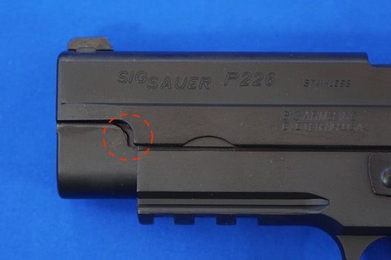 スライド右側刻印「SIG SAUER P226」は実銃の現行モデルも同じ位置にありますが「STENLESS」の刻印は現行モデルでは見られません。メーカー名&所在地刻印フレーム側に移っています。