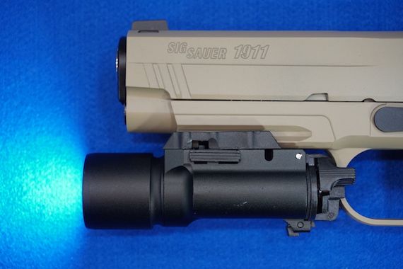 ライトの明るさは雑誌などによれば170ルーメンもあるそうで実物のX300並ですが、レンズとリフレクターが見て分かるぐらいに違うので、光がスポット状にならず拡散してしまいます。トイガン用として、また通常のライトとして使う分には、こちらの方が使い勝手が良いかもしれません。