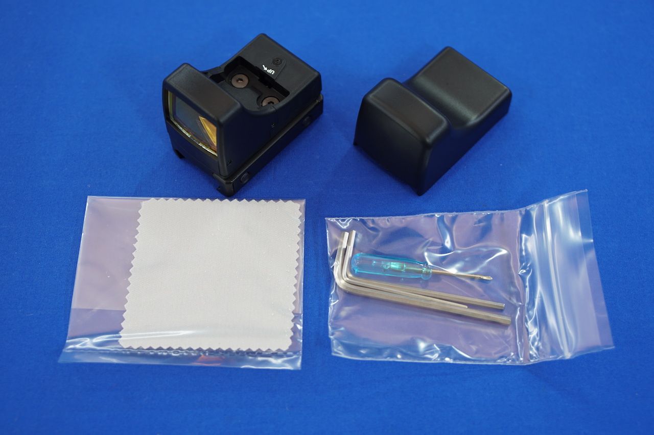 パッケージ内には本体と20mm幅マウント、樹脂製カバー、取り付け・調整用の六角レンチ、取説、レンズ拭きが入っています。