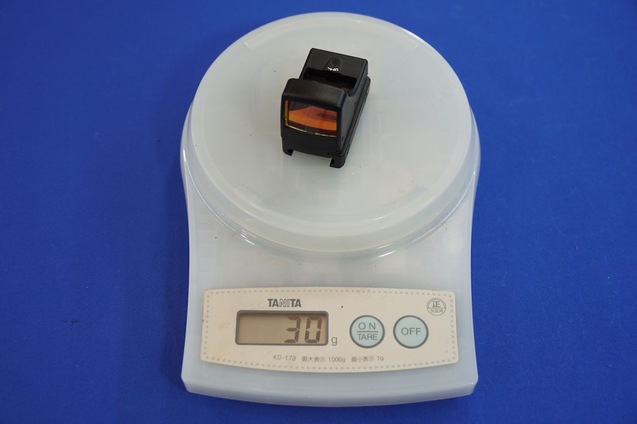 樹脂製ボディのため、20mmマウント付きの重量は30gと、このクラスのドットサイトの約半分の重量となっています。サイト本体だけでは約16gなので、GBBのスライドに取り付けても作動への影響はほとんど無さそうです。