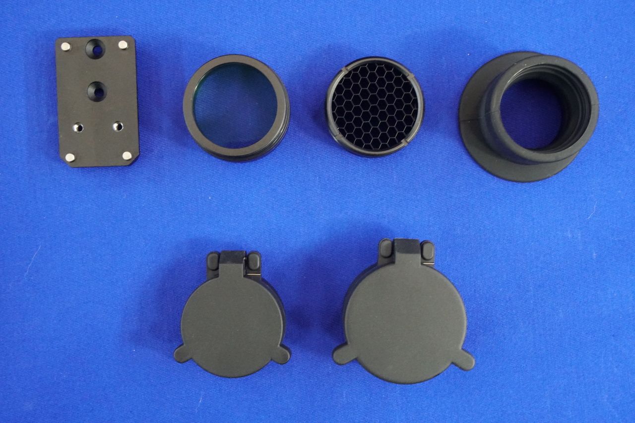 付属品もやたら豊富で、「オープンキャップ」「キルフラッシュ」「レンズガード」「ラバー アイピース」「MRSマウント」が付いてきます。「