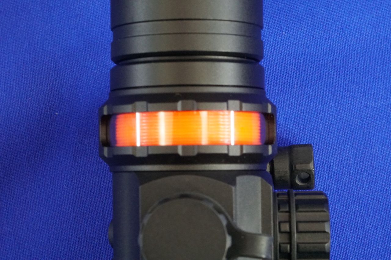 本体上部の集光部はリング状のカバーが付いていて、入る光を調製することでレティクルの明るさを調製できます。室内でも光のあるところでは発光に問題はありませんが、暗がりでは光らないので要注意です。