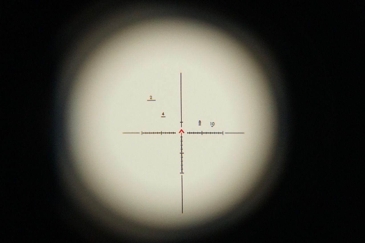 上手く撮影できませんでしたが、レティクルはこのような感じ。センターの赤色になっている山型のところが発光部分です。4倍スコープなので本来は山型の頂点が100mの弾着位置になるはずですが、トイガン用スコープの場合はどうなんでしょう。