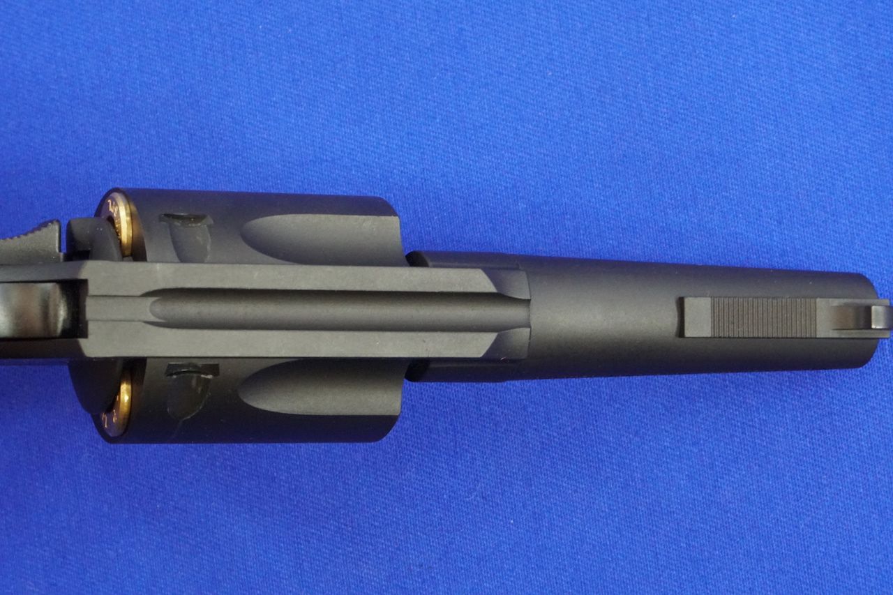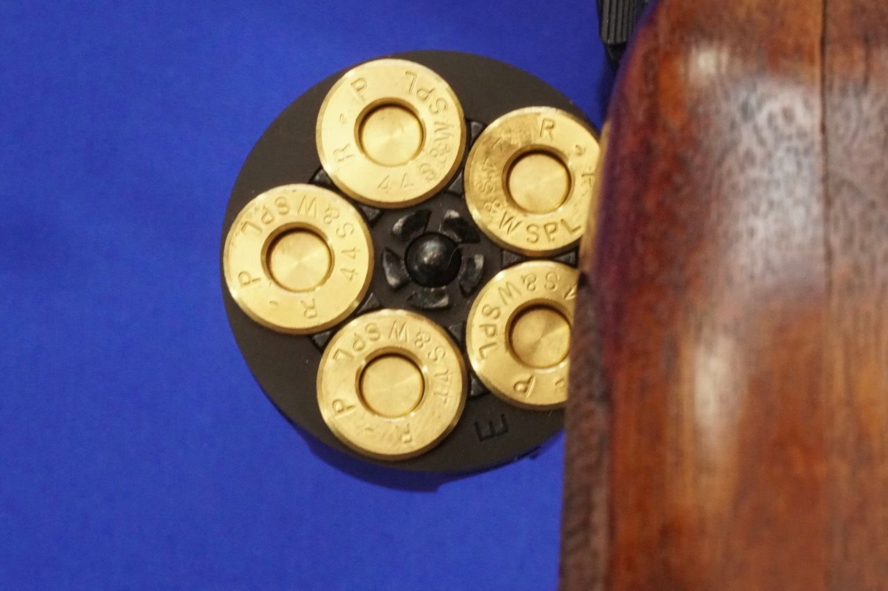 5連発のシリンダーはカートを詰めると隙間が無いぐらいギチギチに見えます。カートの刻印は「44S&W SPL R-P」となっているので、レミントン製の44スペシャル弾をモデルアップしているようです。