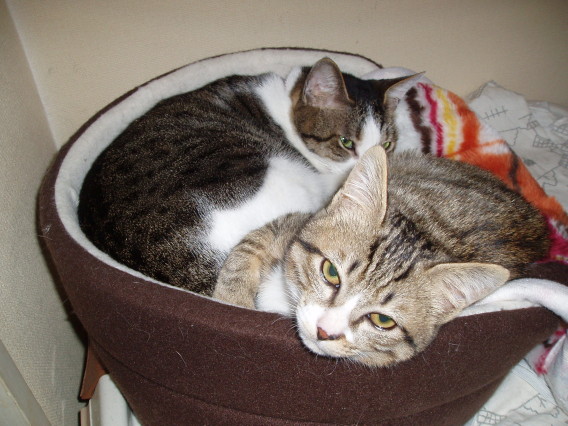 忘れとった!!今日は、不良少女カブキと、 霊感少女モンチッチの誕生日だったと思う??済まない、確かな記憶が無いがきっとそうだ。クソ忙しい時に5匹も生まれて、ゾロ、ジョセフィーヌ、カトリーヌは貰われたのに君たちは売れ残ってそうかもう8年前か。君たちは大きな病気も無く、只カブキは性格が悪い上、去勢手術も上手く行って無いみたいで、その性格の悪さに十八女の時には輪をかけて性格が悪くなってもう8年です。未だにゴロゴロしながら、強烈な猫パンチを出します。早いです。全く油断が成りません。モンチッチは引っ込み思案の大人しい子ですが、時々何かが見えるみたいでひとりで良く遊んでます。よく猫は壁際の小さな虫とかで、あそんだりしますが、彼女はそうでは無く、何も無い虚空を見ながらひとりで喋ってます。夜中に見るとちょっと怖いかな?でも誕生日おめでとう!!お話その2オムツを出来るだけしないように。そんな想いで朝晩の散歩は欠かせないユキさん。最近の熱さにもうヘタって来てます。暫くは元気ですが、家に帰ると死んだ様に寝ます。どうも一日寝てる見たいです。この写真は解り辛いですが、帰って来たときは目開けて寝てます。ちょっとビックリします。お話その3子供だとばかり思っていたポン太。最近よくクロにちょっかい出します。でも、ちょっかいで無く今ポン太が寝てる場所、もともとクロの場所でした。つまりちょっかいを出してるんじゃ無く、クロをどかしていたんだね。時には、家人の側に行き、気が向けばバラモンと一緒に寝て、クロを追い出して、ひとりの寝場所も確保する。一番小さいのに気ままで我が儘放題、やりたい放題。君は誰の真似をしてるんだい??「もちろん、とーちゃんれし!!」