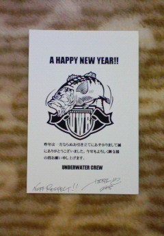 今日起きたら見覚えのある年賀状が。。。カナモからです!俺の住所、名前まで手書きで写真の下の部分にサインがあります♪これはアンダーウォーターのネットショップで2007年に商品を買うとカナモから送られてくるという企画でして。超うれしいです^^名前まで手書きとは★この年賀状大切にしないとwそしてそしてお年玉の方ですが順調に今までにないくらいの勢いでたまっていってますwもう、買うものは完璧に決めてます^^・F1-62XKS「「霧雨」」(メガバス) ・グリップフライ(ブラックフライ)とまあ、この2つです。絶対買ってやるw明日もバイトです^^;今日なんて暇だから8時に上がっていいよって言われて7時59分くらいに帰ろうとしたら人がいきなり来て満席。。結局平常通り9時に終了でした。。いやがらせですかwちなみに俺は洗い場なんですが今日おもしろい客の皿がありましたw豚汁の豚だけ残すのですw豚汁の意味ね~じゃんw では。