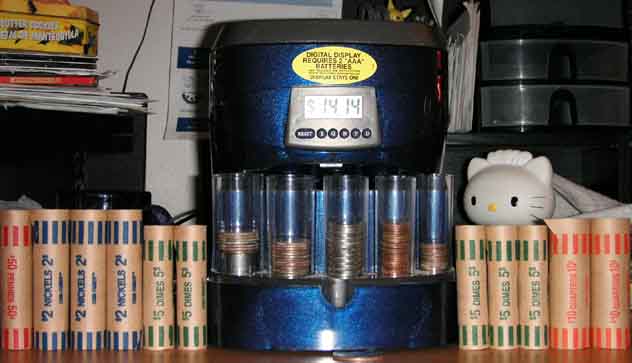 部屋に落ちてる小銭を片っ端から全部拾ったつもり。 左から$0.5、$2x3、$5x5、$14.14(機械)、$10x2。計$65.64。筒はちゃんと入ってます。空じゃありませんwやーすごいね。アバウト7千円の小銭が床に落ちてました(汗