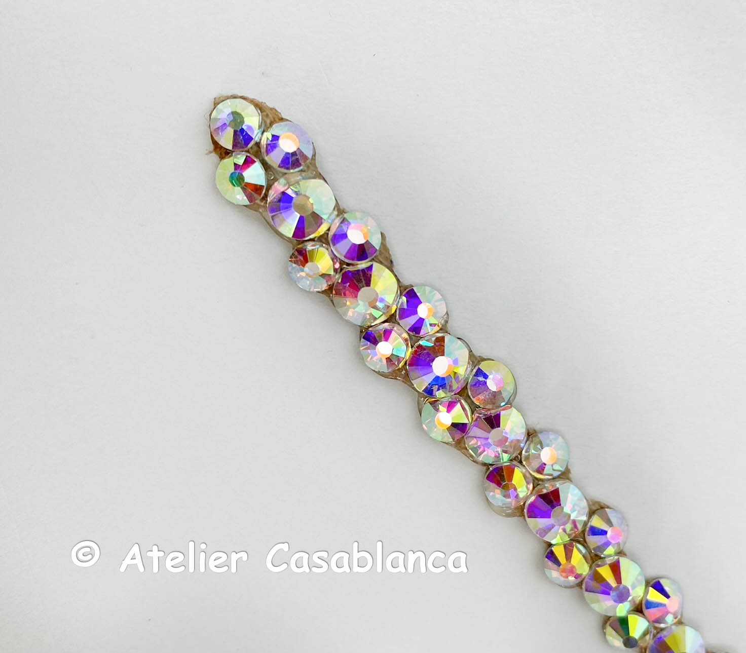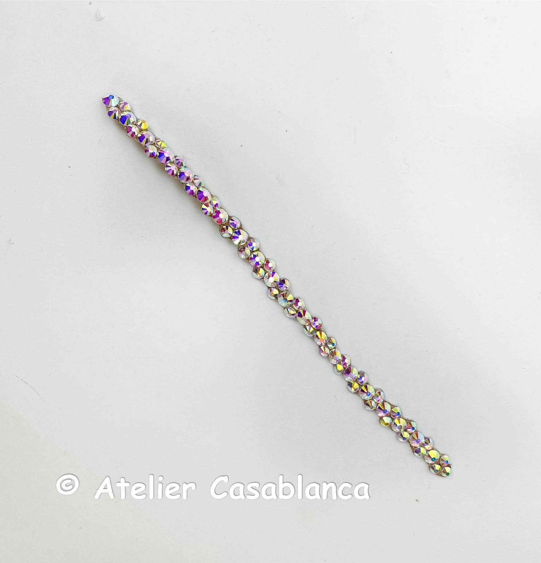長さは20センチで、大小のオーロラの石を組み合わせたシンプルながらとても便利に使えるデザインで、額にかかるように分け目のところに1本だけ着用するのもよいですが、3本または5本を組み合わせて放射状などにしてもとても華やかで効果的で、いろいろと組み合わせることができます。