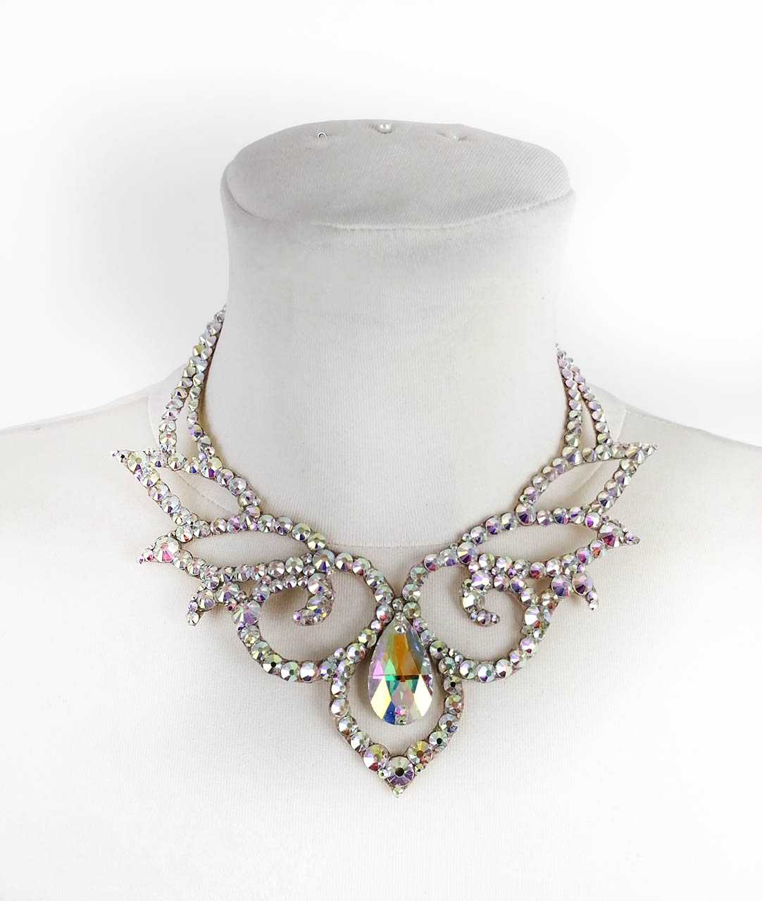 首の後ろにチェーンの金具がつけられているので長さの調整がしやすい便利なデザイン。肌に触れてもとてもやさしい品質の高いベージュのフェルト素材を台に使っており、左右対称になった唐草模様のオリジナルデザインがとても上品で華やかで美しく、大きな石と石の間を非常に小さなオーロラの石(ネイルアートなどに使われるぐらいのサイズ)で埋めているため、チョーカー全体が石でぎっしり埋まっていて、とても美しく輝く超品質の高いネックレスです。