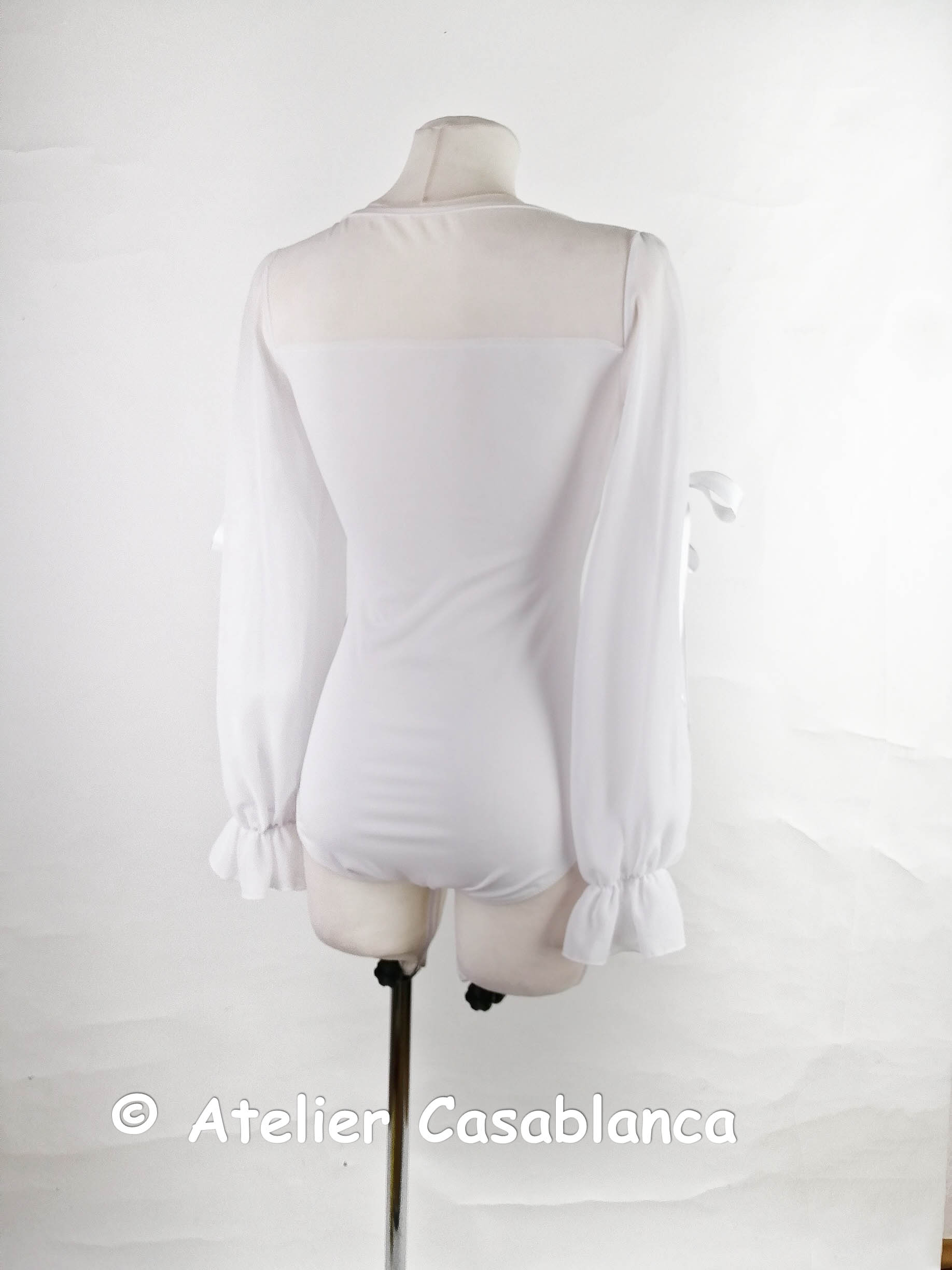 ドイツの選手所有のふんわりとした白の袖のデザインとフロントの黒のボタンのデザインが大変美しい白のレオタードです。