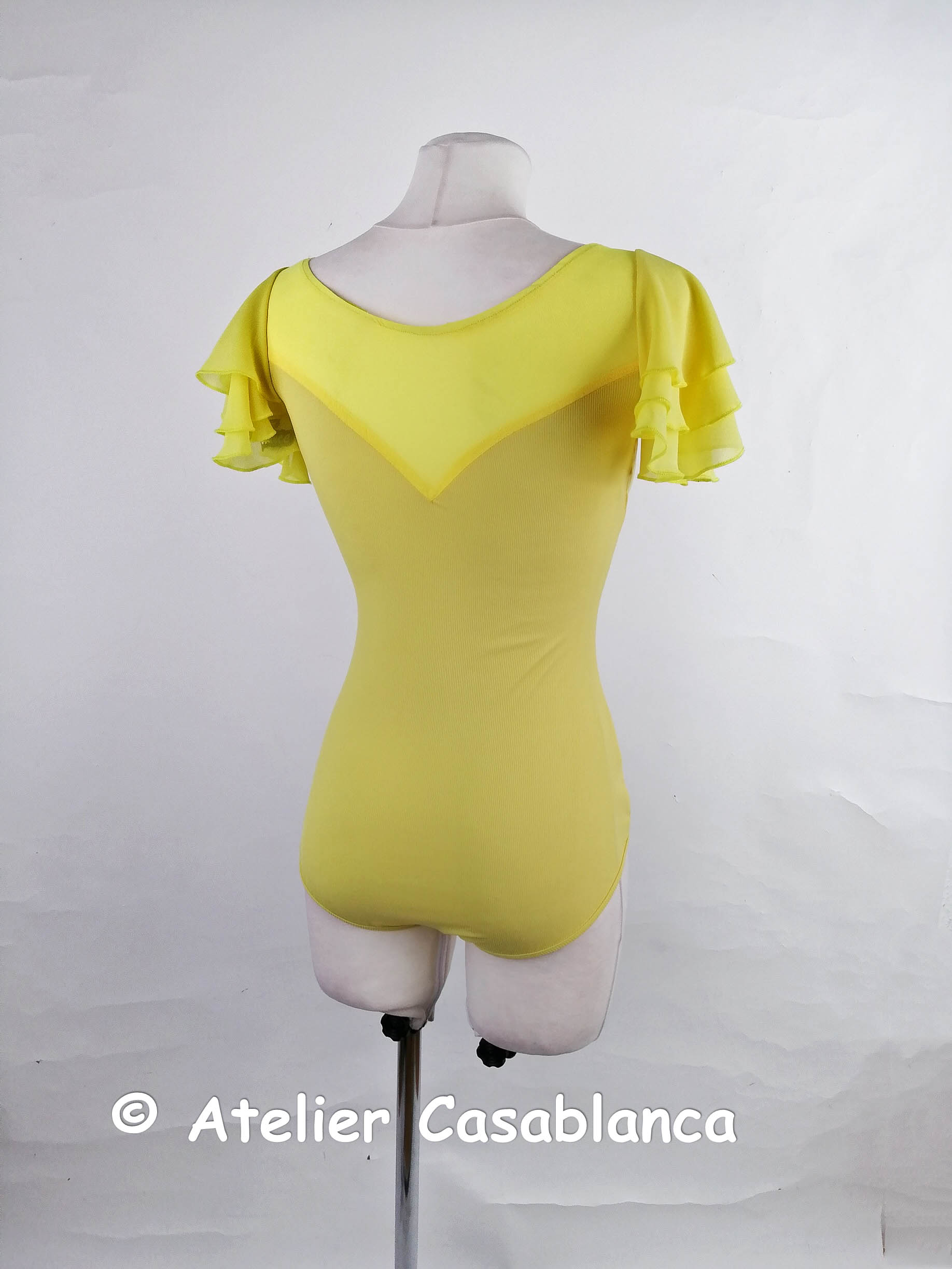 ドイツの選手所有の、肩のフリルが大変美しく二の腕が華奢に見える大変美しいイエローのレオタードです。