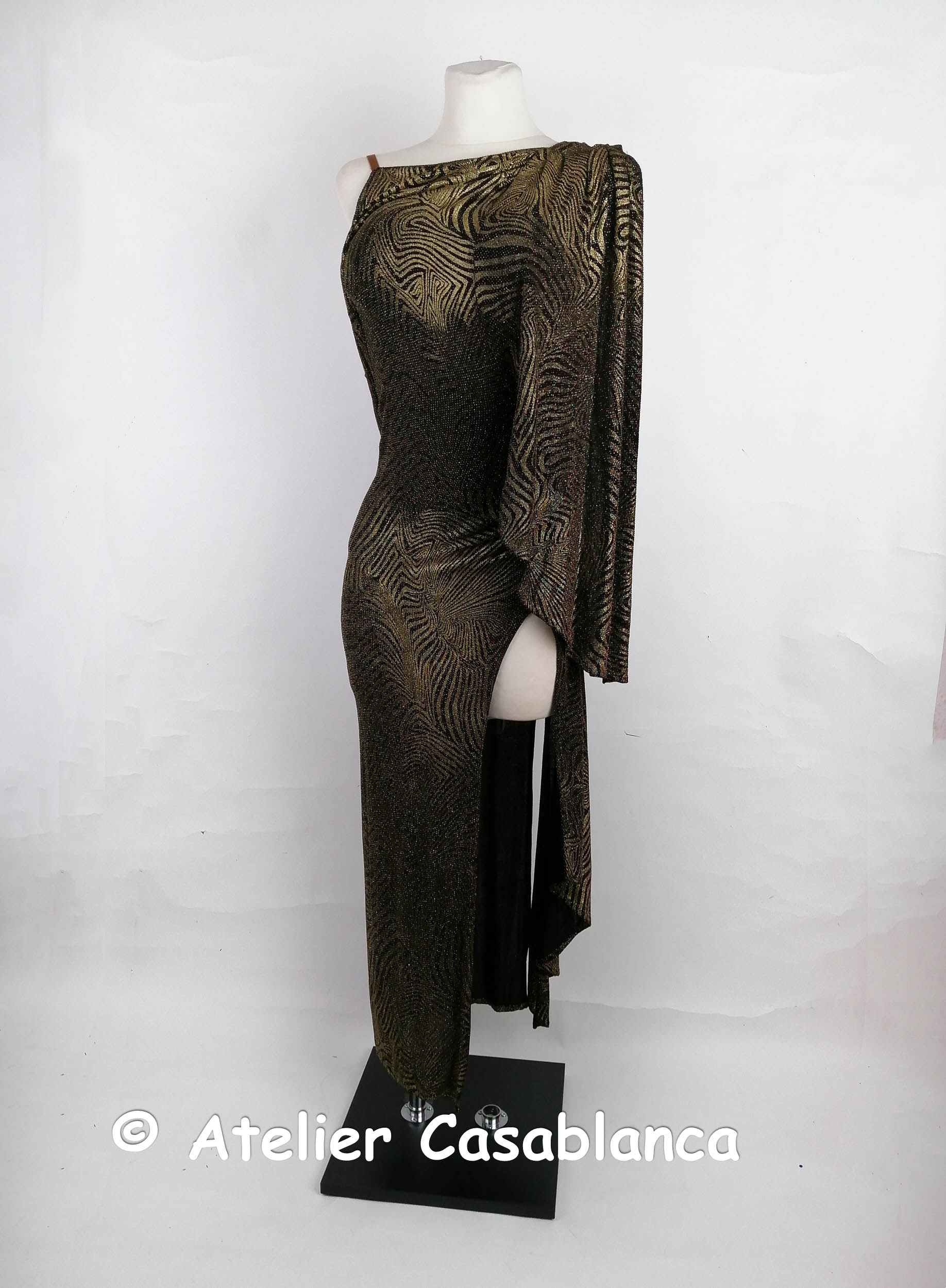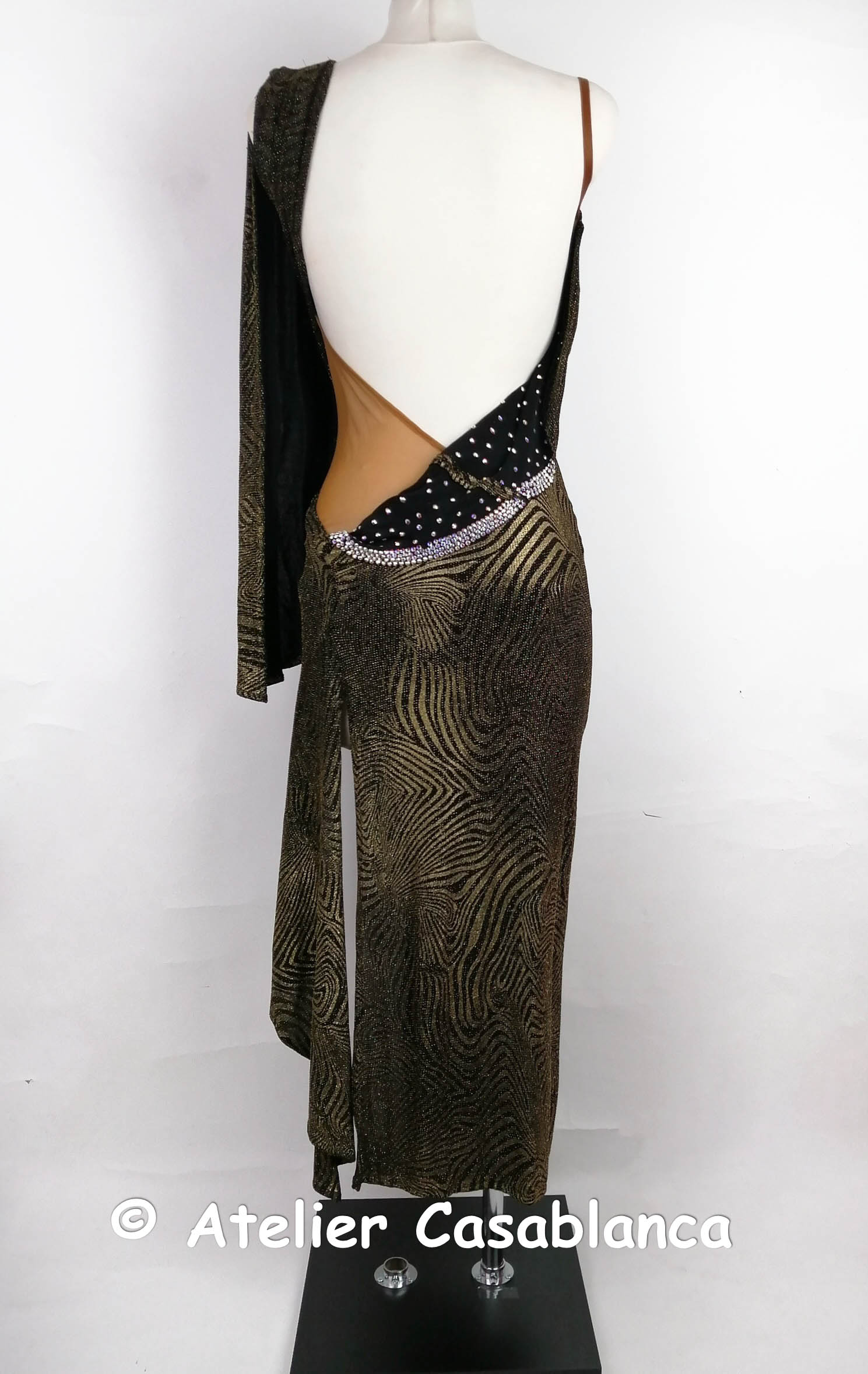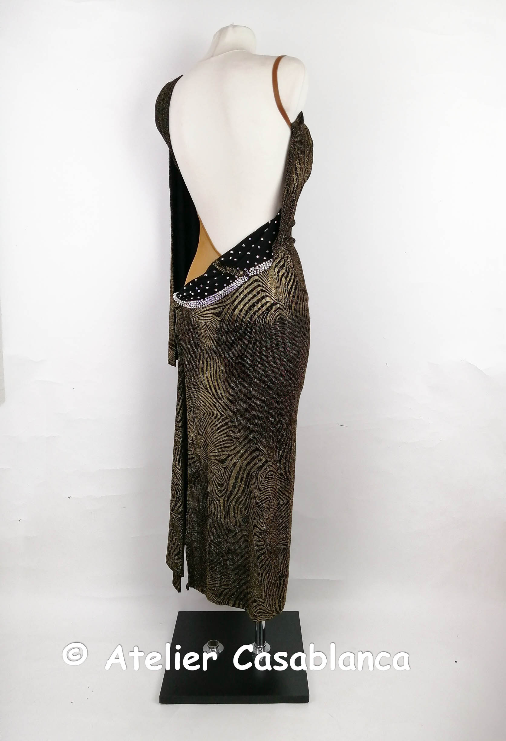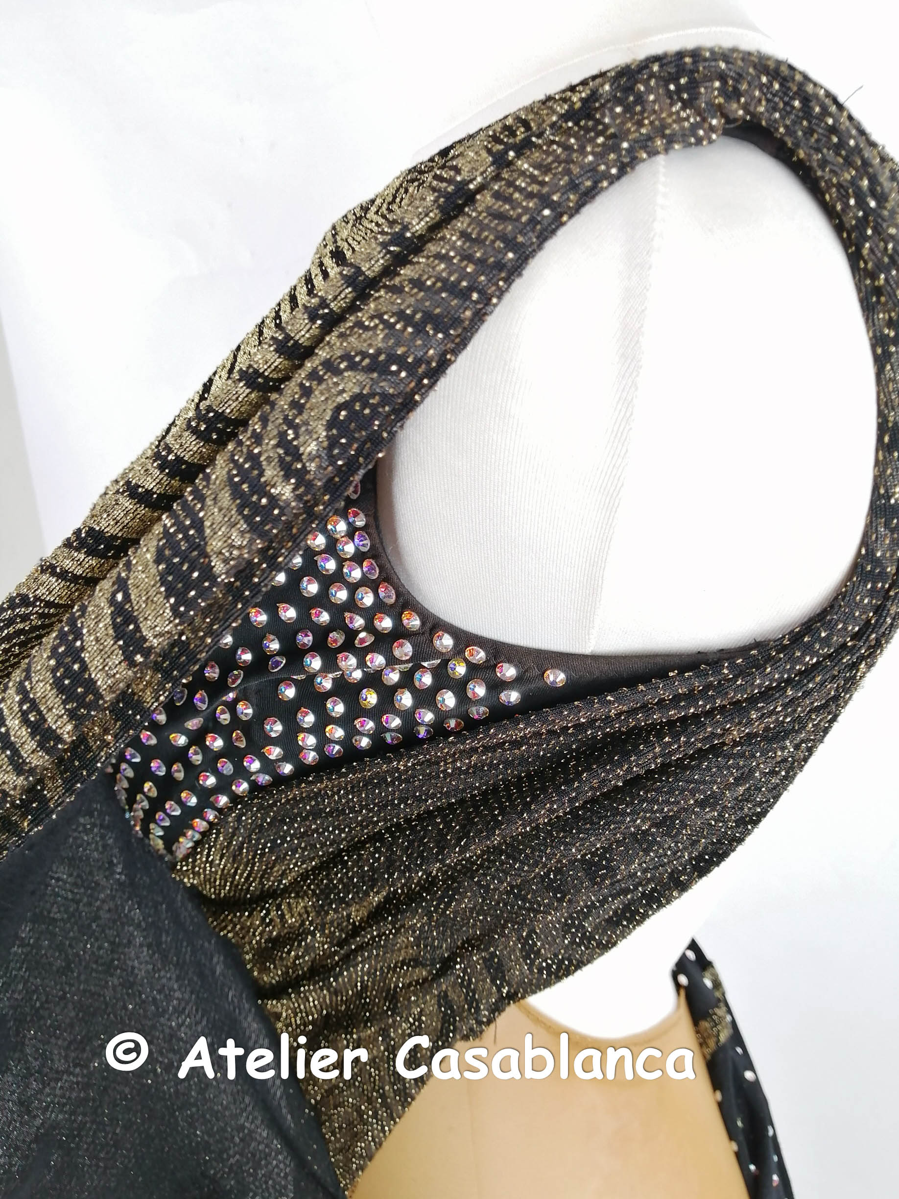 黒のラメが入ったストレッチ素材の布にゴールドの柄が入っており、濃い部分と薄い部分がありグラデーションのようになっており、特に胸の下、ウェスト部分に暗めの布を配色しているのでとてもスタイル良く見えるデザインです。使われている石はすべてオーロラのスワロフスキの石です。