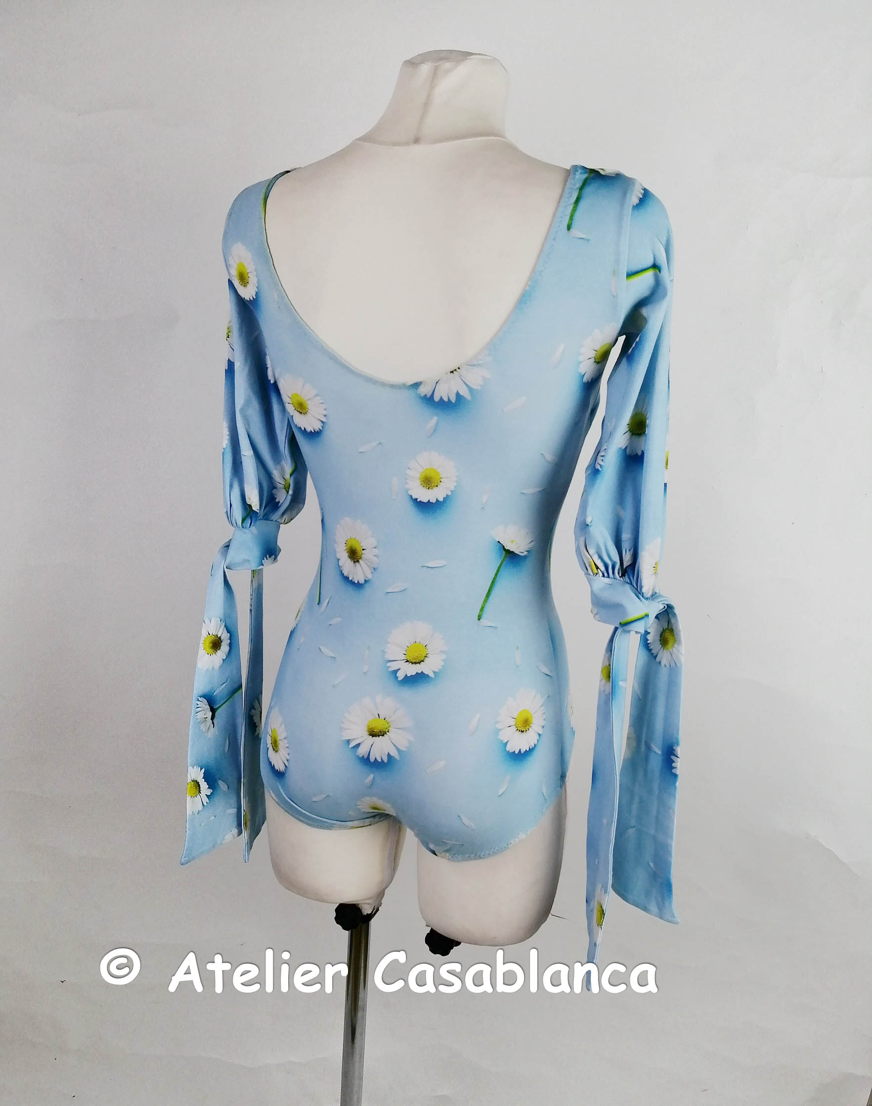 ブラックプールセミファイナリストのタイトルを持つウクライナのトップユース選手所有のさわやかなブルーにイエローの花を組み合わせたプリント柄がとても美しい七分袖のレオタードです。